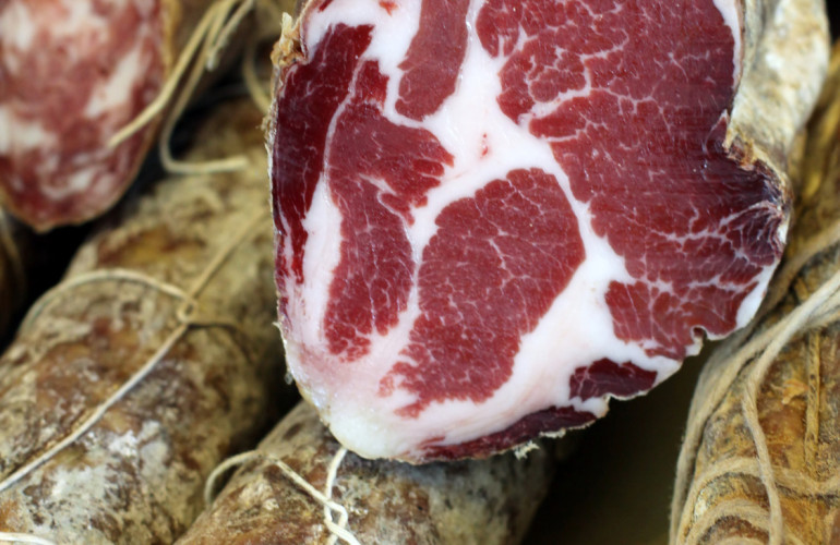 Nella foto: ossocollo, salume stagionato e preparato impiegando i muscoli del collo del maiale.