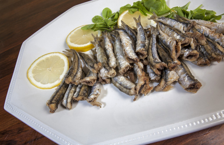 Nella foto: piatto di alici fritte con radicchio e limone. Ricetta tipica triestina.